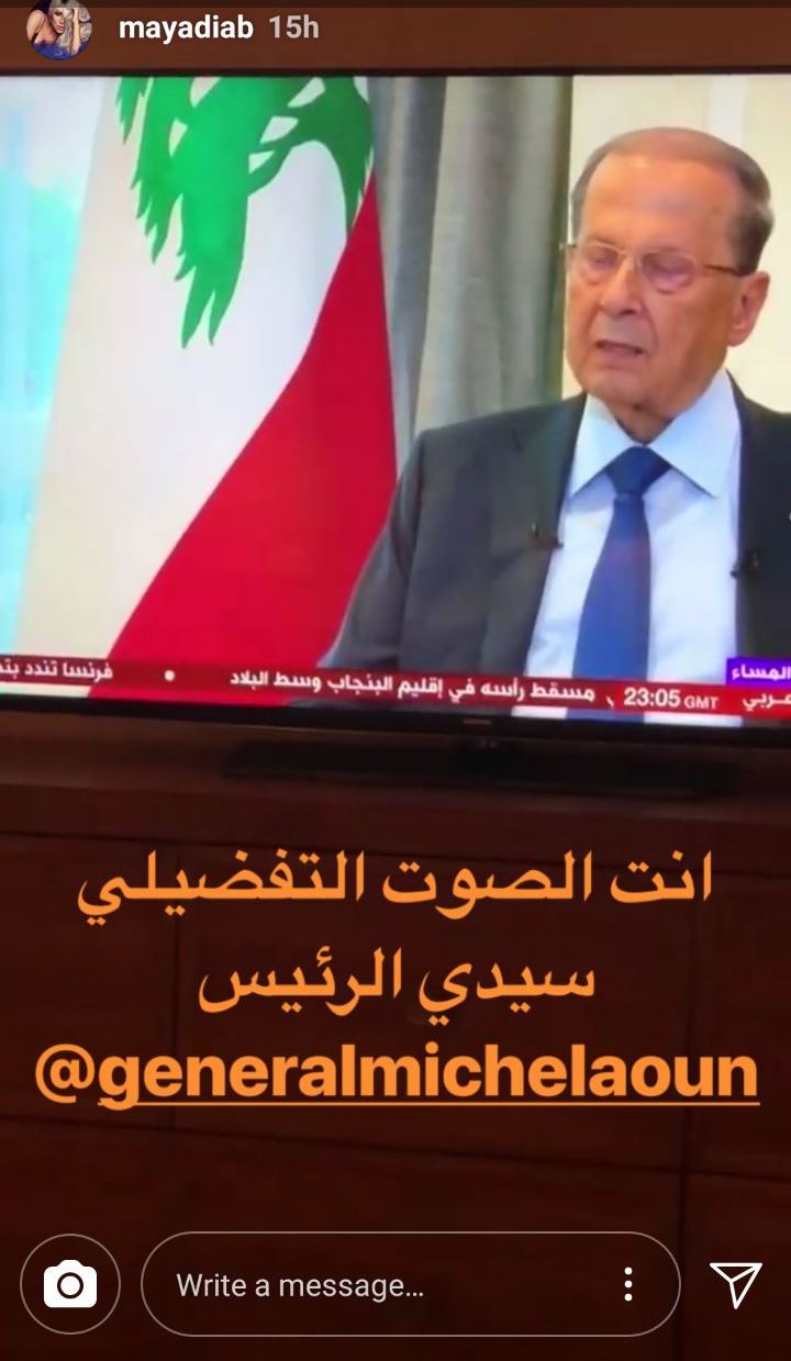 في سياق آخر، نشرت مايا فيديو لخطاب رئيس الجمهورية ميشال عون يوم الأحد وعلقت عليه قائلة "إنت الصوت التفضيلي سيدي الرئيس."