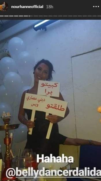 أقامت الفنانة نورهان حفلاً بمناسبة طلاقها من زوجها عارض الأزياء عدنان الديراني حضره عدد من أصدقاءها.