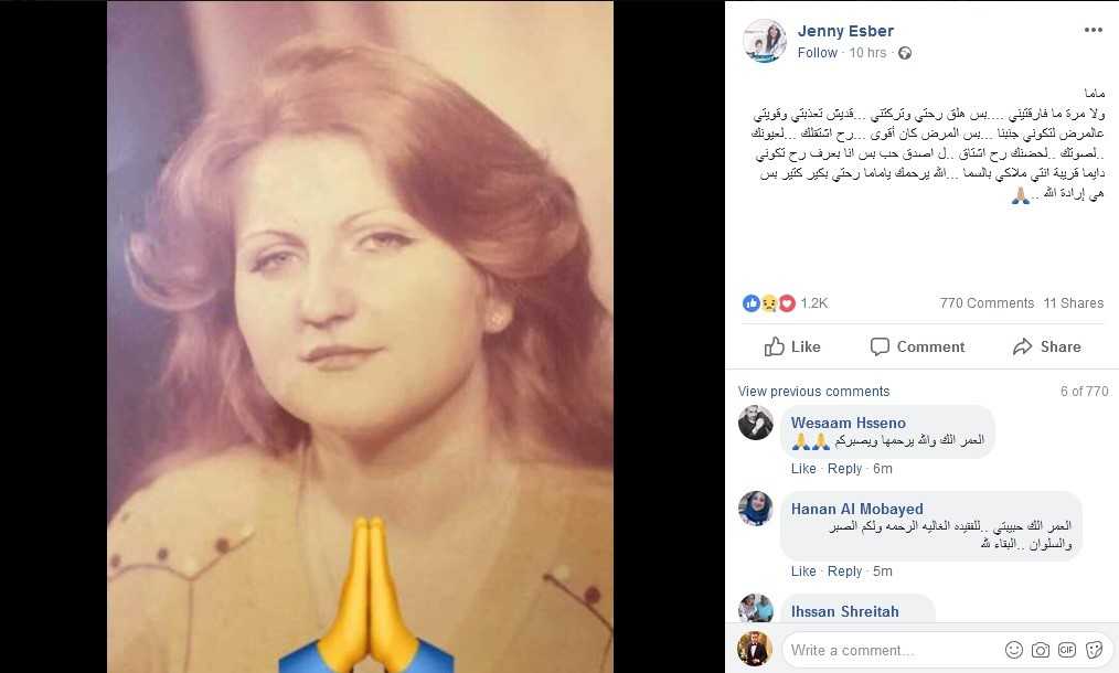 ونعت جني والدتها بكلمات مؤثرة عبر حسابها الخاص على "فايسبوك" حيث كتبت: "ماما ولا مرة ما فارقتيني.. بس هلق رحتي وتركتني.. قديش تعذبتي وقويتي عالمرض لتكوني جنبنا.. بس المرض كان أقوى .. رح اشتقلك ...لعيونك ..لصوتك ..لحضنك رح اشتاق ..ل اصدق حب بس انا بعرف رح تكوني دايما قريبة انتي ملاكي بالسما .. ..الله يرحمك ياماما رحتي بكير كتير بس هي إرادة الله ..".