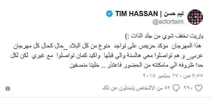 هذا التعليق القاسي من مرتجى استدعى رداً سريعاً من النجم السوريتيم حسن، الذي نوّه بالقيمين على هذا المهرجان، متمنياً عدم العمل على جلد الذات، وقال: "هم تواصلوا معي هالسنة والي قبلها وأكيد كمان تواصلوا مع غيري. لكن لكل حدا ظروفه الي ما مكنته من الحضور فاعتذر".