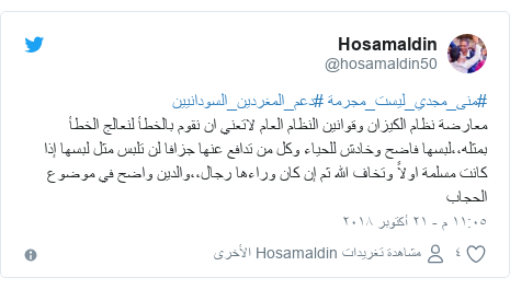 " alt="تويتر رسالة بعث بها @hosamaldin50: #منى_مجدي_ليست_مجرمة #دعم_المغردين_السودانيينمعارضة نظام الكيزان وقوانين النظام العام لاتعني ان نقوم بالخطأ لنعالج الخطأ بمثله،،لبسها فاضح وخادش للحياء وكل من تدافع عنها جزافا لن تلبس مثل لبسها إذا كانت مسلمة اولاً وتخاف الله ثم إن كان وراءها رجال،،والدين واضح في موضوع الحجاب" width="465" height="264" data-highest-encountered-width="485" />