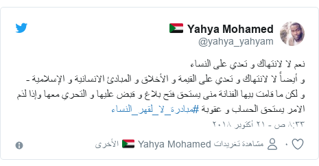 " alt="تويتر رسالة بعث بها @yahya_yahyam: نعم لا لانتهاك و تعدي على النساء و أيضاً لا لانتهاك و تعدي على القيمة و الأخلاق و المبادئ الانسانية و الإسلامية -و لكن ما قامت بيها الفنانة منى يستحق فتح بلاغ و قبض عليها و التحري معها وإذا لذم الامر يستحق الحساب و عقوبة #مبادرة_لا_لقهر_النساء" width="465" height="242" data-highest-encountered-width="485" />