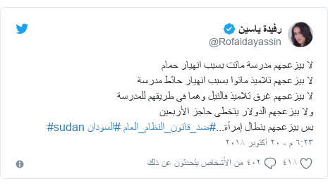 " alt="تويتر رسالة بعث بها @Rofaidayassin: لا بيزعجهم مدرسة ماتت بسبب انهيار حمام لا بيزعجهم تلاميذ ماتوا بسبب انهيار حائط مدرسة لا بيزعجهم غرق تلاميذ فالنيل وهما في طريقهم للمدرسةولا بيزعجهم الدولار يتخطى حاجز الأربعين بس بيزعجهم بنطال إمرأة...#ضد_قانون_النظام_العام #السودان #sudan" width="465" height="264" data-highest-encountered-width="485" />