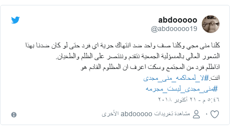" alt="تويتر رسالة بعث بها @abdooooo19: كلنا منى مجي وكلنا صف واحد ضد انتهاك حرية اي فرد حتى لو كان ضدنا بهذا الشعور العالي بالمسؤلية الجمعية نتقدم وننتصر على الظلم والطغيان.اذاظلم فرد من المجتمع وسكت اعرف ان المظلوم القادم هو انت.#لا_لمحاكمه_منى_مجدى #منى_مجدى_ليست_مجرمه" width="465" height="264" data-highest-encountered-width="485" />