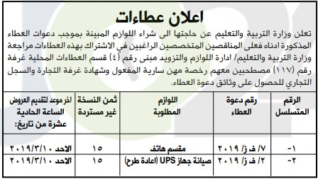 تعلن وزارة التربية والتعليم عن حاجتها الي شراء اللوازم المبينة بموجب دعوات العطاء المذكورة ادناه