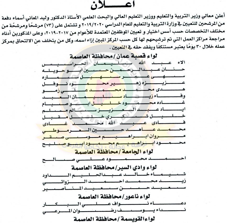 اعلن وزير التربية والتعليم ووزير التعليم العالي والبحث العلمي وليد المعاني اسماء دفعة من المرشحين للتعيين في وازرة التربية للعام الدراسي 2020-2019 وتشتمل على 247 مرشحا ومرشحة ممن مختلف التخصصات حسب اسس اختيار وتعيين الموظفين المعتمدة للاعوام 2017-2019 وعلى المذكورين ادناه مراجعة مراكز العمل التي تم ترشيحهم لها كل حسب المركز المبين