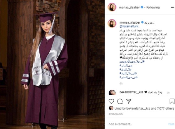 وأضافت: "أنا هي أمك... نعم يا ابنتي لا أخفي عليك فأنا فخوره بك فخوره بنجاحاتك بل وتدمع عيناي من الفرح حين أراكي في أعلى المراتب أبارك لكي نجاحك وجميع انجازاتك واتمنى من الله ان يحفظك من كل مكروه أنتي وإخوتك#أم_حلا_وعبدالله_ومحمد #منى_السابر”.