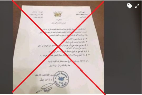 بالطبع لا. الوثيقة التي انشغل بها مستخدمون لوسائل التواصل الاجتماعي، وتحمل توقيع "وزير الأوقاف والارشاد اليمني أحمد عطية"، وتزعم ان "وزارة الأوقاف اليمنية قررت إلزام الرجل أن يتزوج بما لا يقل عن امرأتين..."، وثيقة قديمة ومزوّرة. وسبق أن انتشرت كخدعة ابتداء من عام 2016 بمزاعم أنها صدرت في العراق واريتريا، وايضا السودان والسعودية. كذلك، أعلن عطية انه لم يصدر قرارا مماثلا، وأن الوثيقة "مزورة ومدبلجة فوتوشوب".