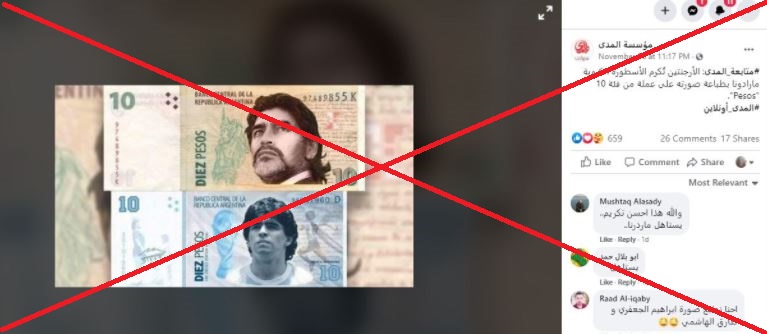 كلا، العملتان الورقيتان اللتان تم تناقلهما بمزاعم أن "دولة الأرجنتين تُكرم الأسطورة الكروية مارادونا بطبع صورته على عملة من فئة 10 بيزو"، عملتان غير حقيقيتين، وهما تصميم يتداوله مشجعون لمارادونا في وسائل التواصل الاجتماعي، منذ أعوام عدة، في إطار حملة لطبع صورته على عملة ورقية من فئة 10 بيزو.