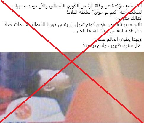 الصورة التي تداولها مستخدمون كثر لوسائل التواصل الاجتماعي وتظهر زعيم كوريا الشمالية كيم جونغ أون مسجى، و"أنباء شبه مؤكدة عن وفاته، واستعدادات لتسليم أخته كيم يو جونغ السلطة"، وفقا للمزاعم المرفقة بها، كانت صورة مركبة، بحيث تم وضع وجه الزعيم كيم محل وجه والده الراحل كيم جونغ ايل، فيما كان مسجى في بيونغ يانغ، في 20 كانون الاول 2011.