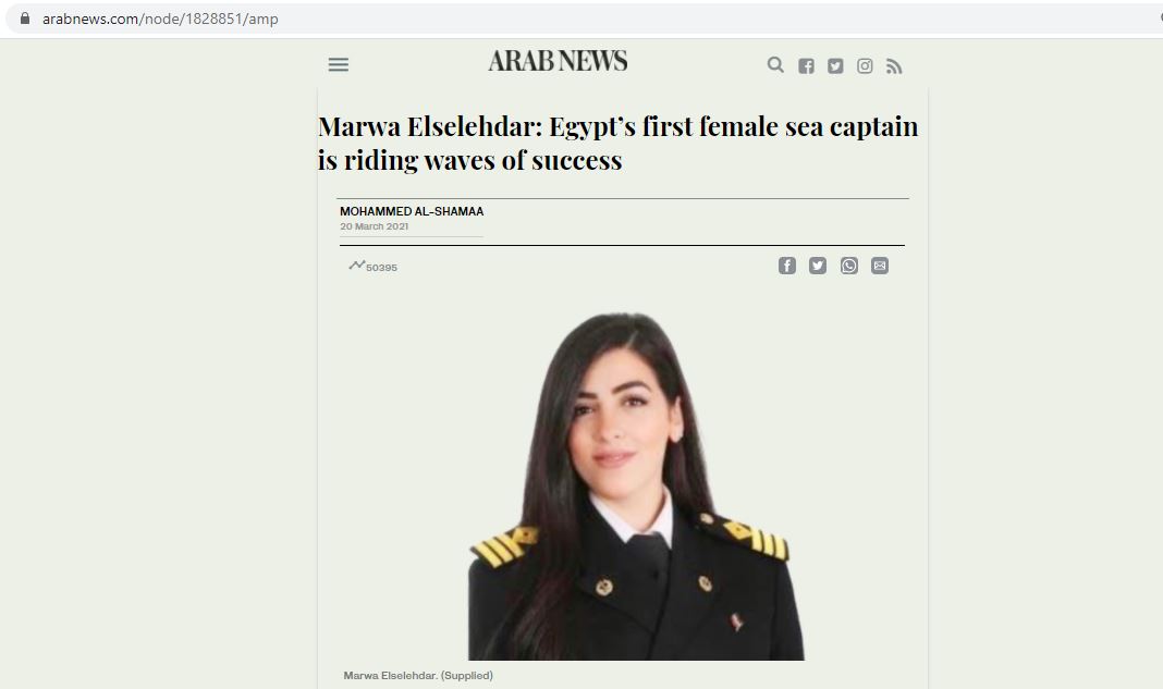 وأوضحت أن "الخبر الذي يتداوله رواد مواقع التواصل الاجتماعي، هو في الأساس كان احتفاءً بها تزامنًا مع احتفال الدولة المصرية بالمرأة هذا الشهر، والمساهمات التي قدمتها في مجال النقل البحري".