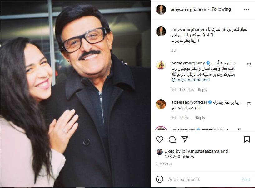 نشرت الفنانة إيمى سمير غانم، على حسابها الخاص بـ"إنستغرام" صورة لها مع والدها الراحل الفنان سمير غانم وجهت من خلالها رسالة إليه.