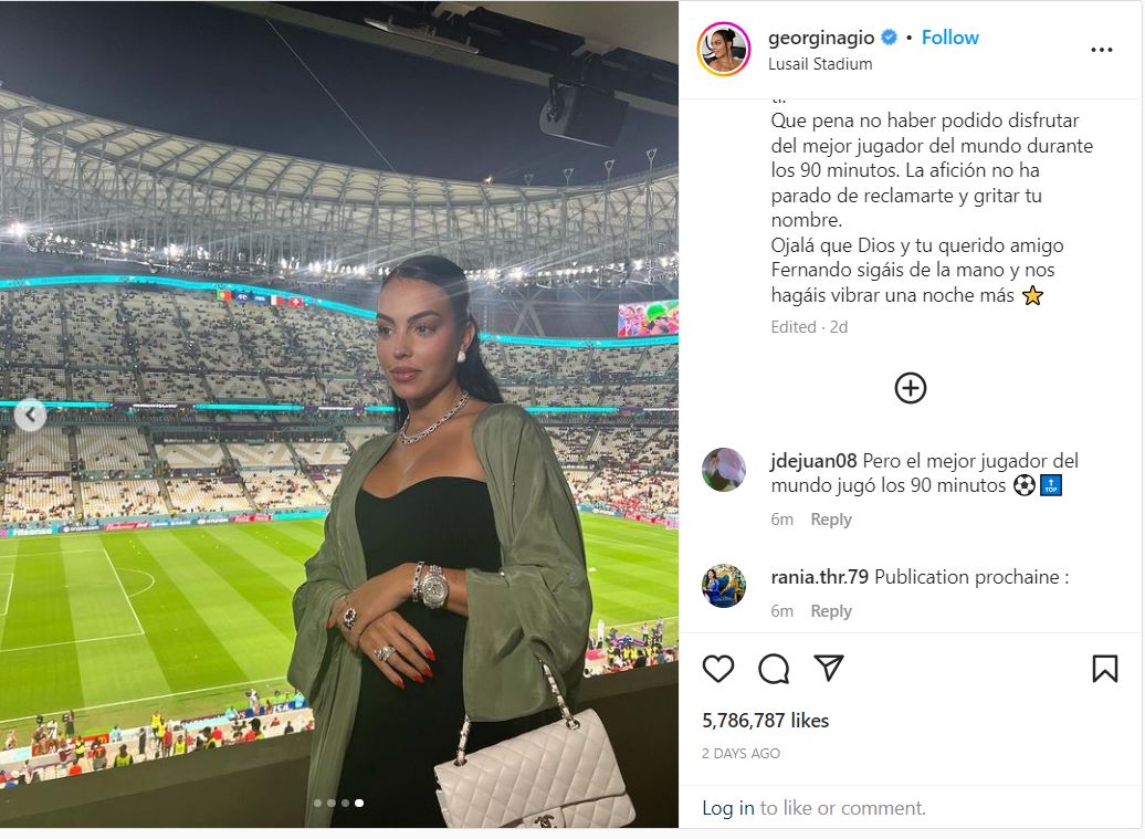 وكانت جورجينا قد انتقدت في وقت سابق، قرار مدرب البرتغال عدم إشراك رونالدو أساسياً في مباراة بلاده أمام سويسرا في مونديال 2022 والتي انتهت بنتيجة 6-1 للبرتغال. ونشرت من المباراة السابقة قبل بدايتها وأثناء تأدية نشيد البلدين، فيديو يُظهر اهتمام الصحافة بمقاعد البدلاء أكثر من اهتمامهم باللاعبين الأساسيين، في إشارة منها إلى أهمية رونالدو بأن يكون بين اللاعبين الأساسيين للمنتخب البرتغالي. وغداً السبت يقابل المنتخب البرتغالي نظيره المغربي الذي فاز على الفريق الإسباني بركلات ترجيح في المباراة التي أقيمت على ملعب المدينة التعليمية ليتأهل إلى الدور ربع النهائي. وتعد هذه هي المرة الأولى التي يتأهل فيها منتخب عربي إلى الدور ربع النهائي للمونديال.