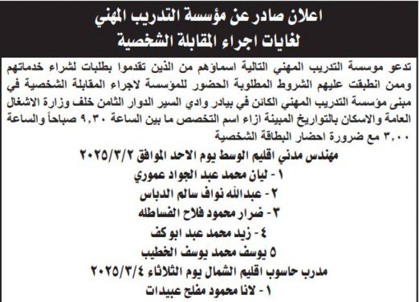 - دعت مؤسسات حكومية مرشحين لاجراء المقابلات الشخصية لغايات استكمال أجراءات التعيين .