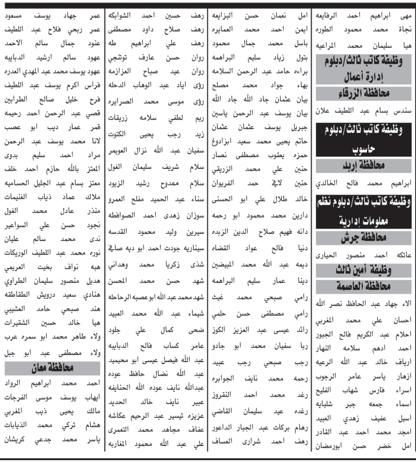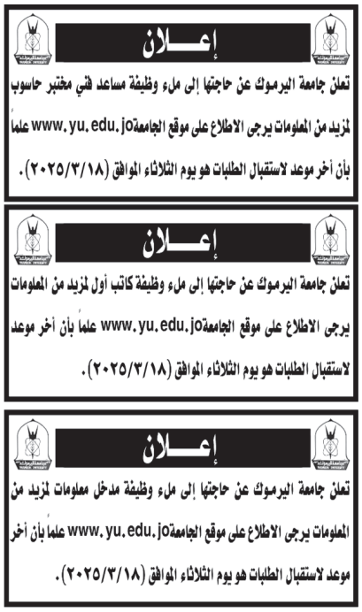 وكما اعلنت مؤسسة التدريب المهني عن حاجتها لتعبئة شاغر وظيفي لديها ، ودعت وزارة الزراعة مرشحين لاستكمال اجراءات التعيين، وكما أعلنت جامعة اليرموك عن توفر عدد من الشواغر الوظيفية .