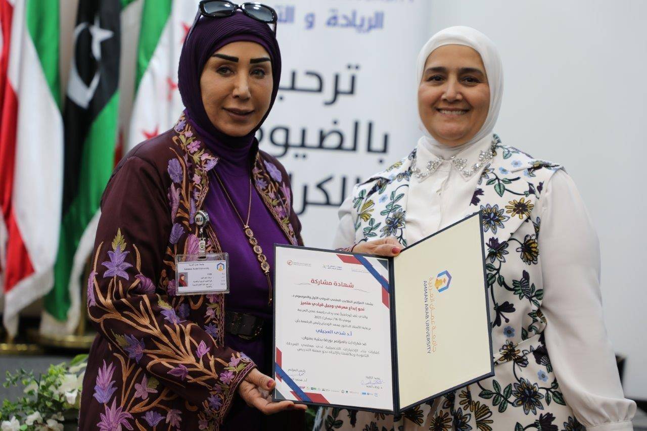 وفي ختام أعمال المؤتمر قامت الدكتورة وفاء العيد عميد كلية العلوم التربوية والنفسية في جامعة عمان العربية، بتكريم الباحثين والطلبة المشاركين وأعضاء اللجان المنظمة، تقديرًا لجهودهم المميزة في إنجاح هذا الحدث العلمي النوعي، معربة عن فخرها بمستوى الأوراق البحثية المقدمة، ومؤكدة أن هذا المؤتمر شكّل مساحة حقيقية لإبراز إبداعات الطلبة وتعزيز قدراتهم البحثية، كما ثمّنت العيد دعم رئاسة الجامعة للمشاركين من داخل المملكة وخارجها، متطلعةً إلى مواصلة تنظيم مثل هذه الفعاليات النوعية مستقبلاً.