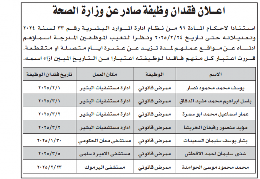 فيما أعلنت وزارة الصحة في إعلان رسمي اليوم الأحد، عن أسماء موظفين فاقدين لوظائفهم بسبب تغيبهم عن العمل مدة 10 أيام متواصلة أو متقطعة بدون إشعار إداراتهم.