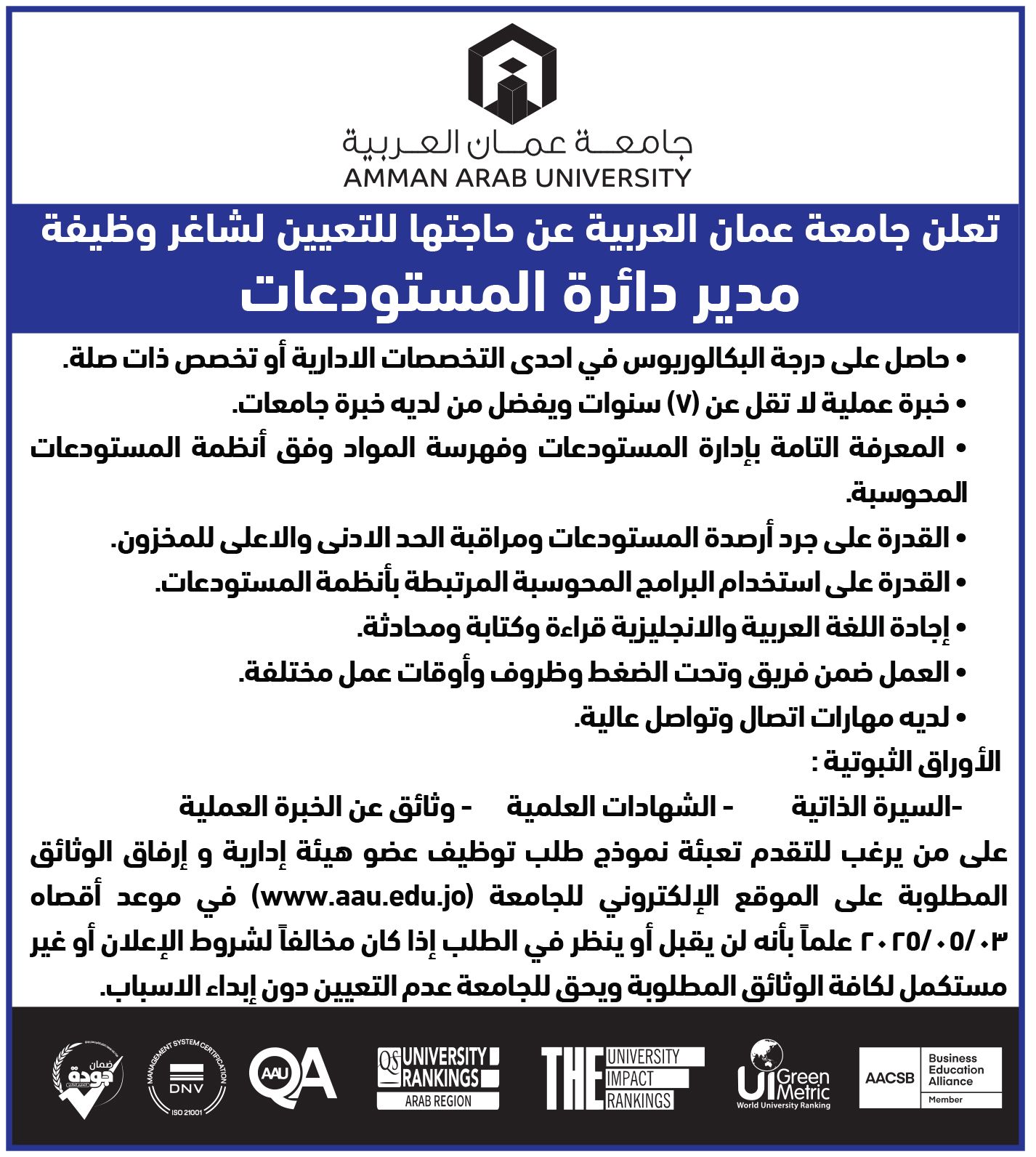 تعلن جامعة عمان العربية عن حاجتها للتعيين شاغر وظيفة "مدير دائرة المستودعات"