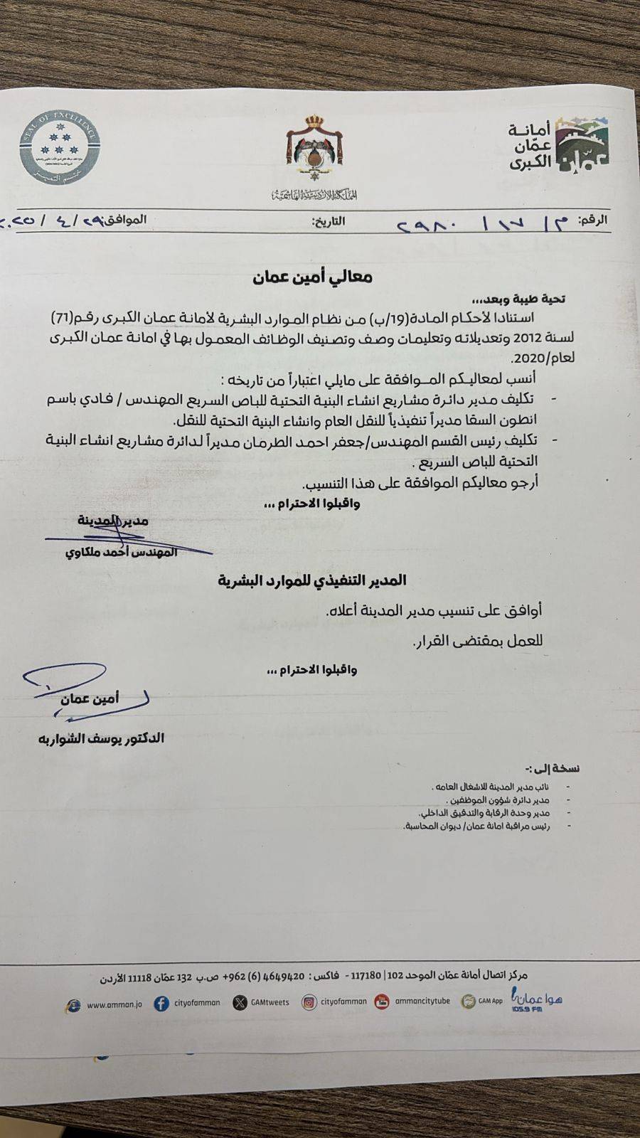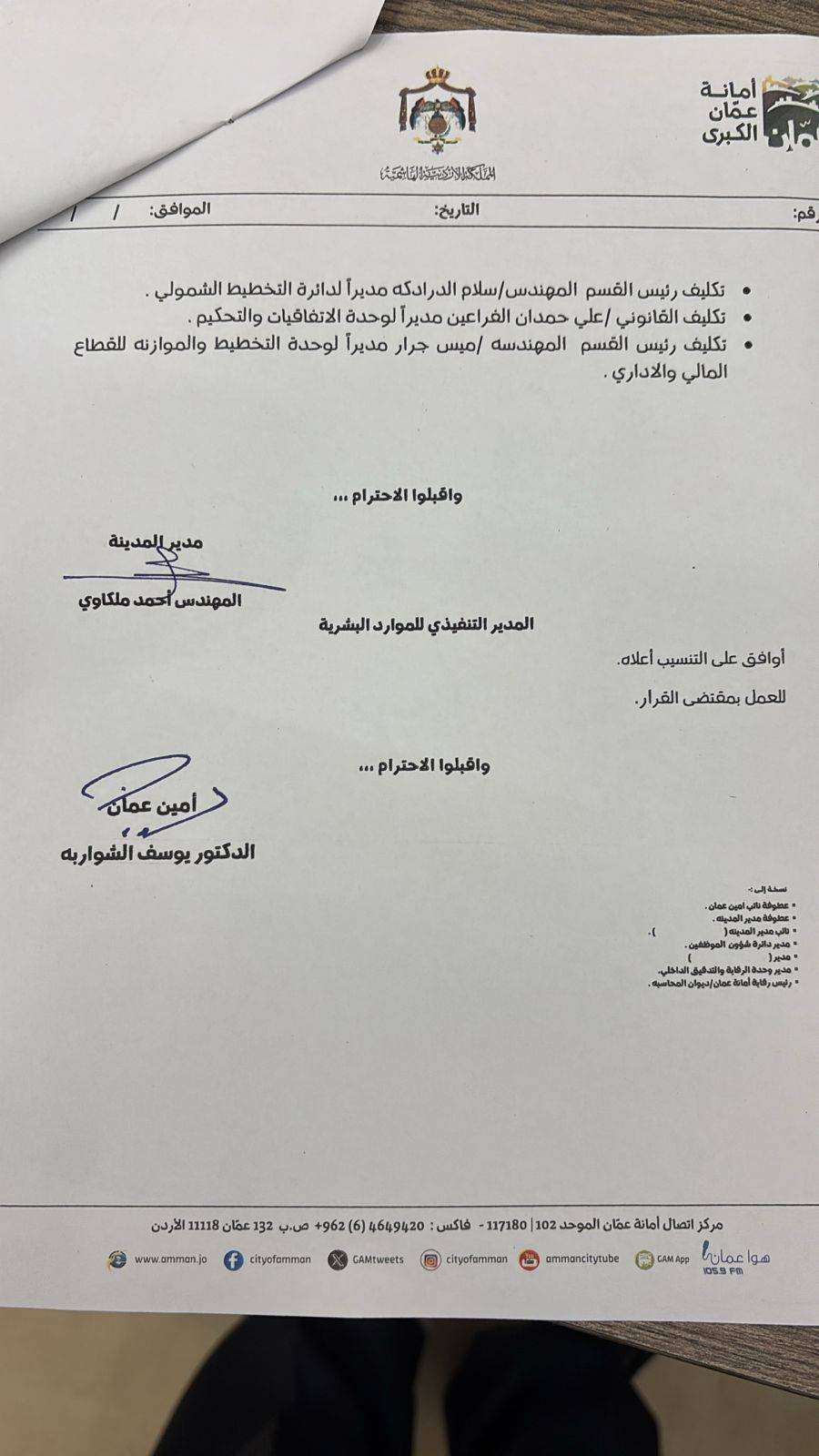 كما قرر أمين عمان تكليف عدد من المدراء بوظائف إدارية مختلفة، ونقل مفتشين ليتولوا ادارة مديريات ووحدات مختلفة، وتكليف رؤساء أقسام ليكونوا مديري دوائر.