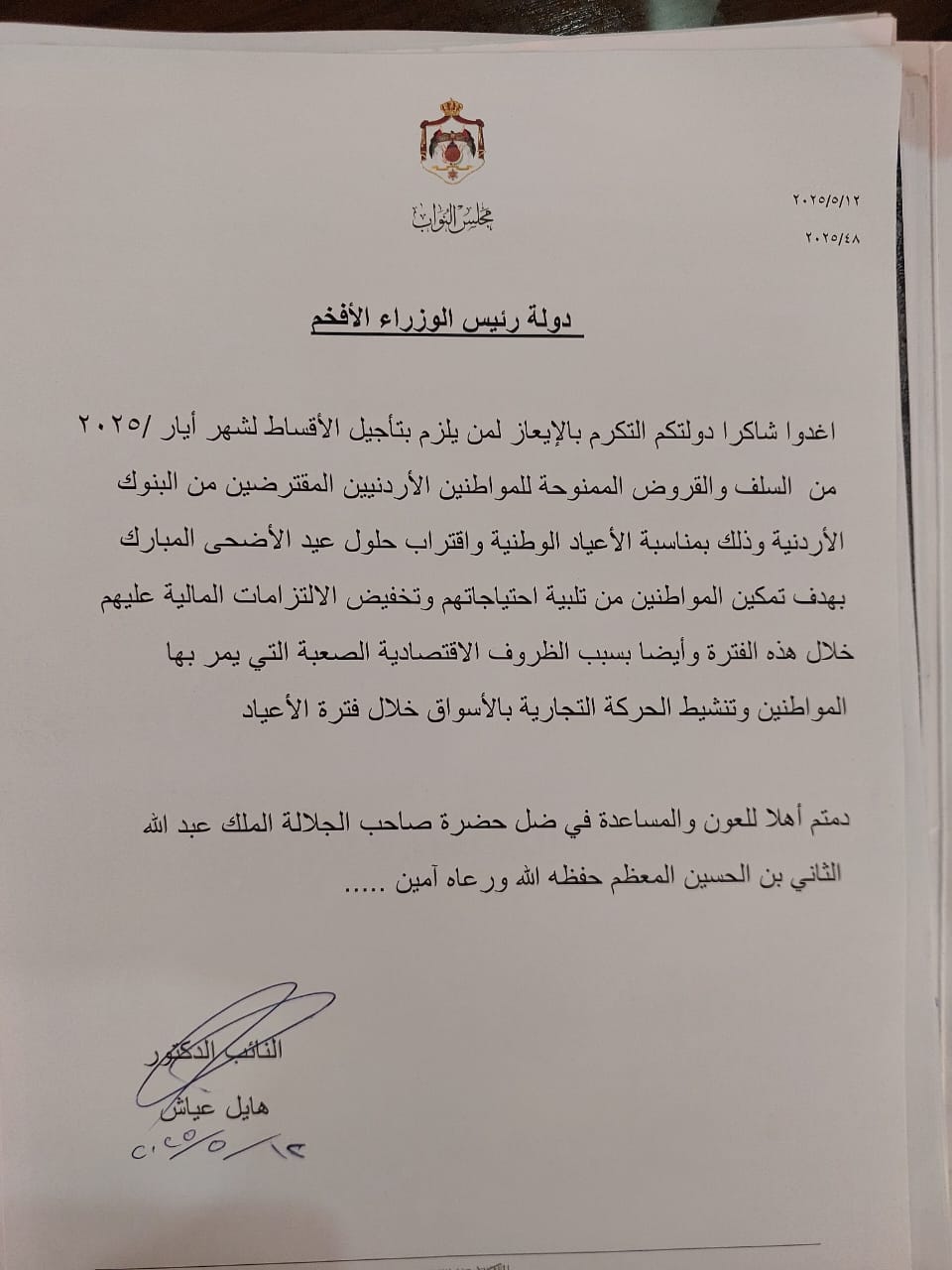 طالب النائب هايل عياش رئيس الوزراء الدكتور جعفر حسان بالإيعاز لمن يلزم بتأجيل أقساط قروض البنوك عن شهر أيار الحالي، وذلك بمناسبة الأعياد الوطنية وعيد الأضحى المبارك.