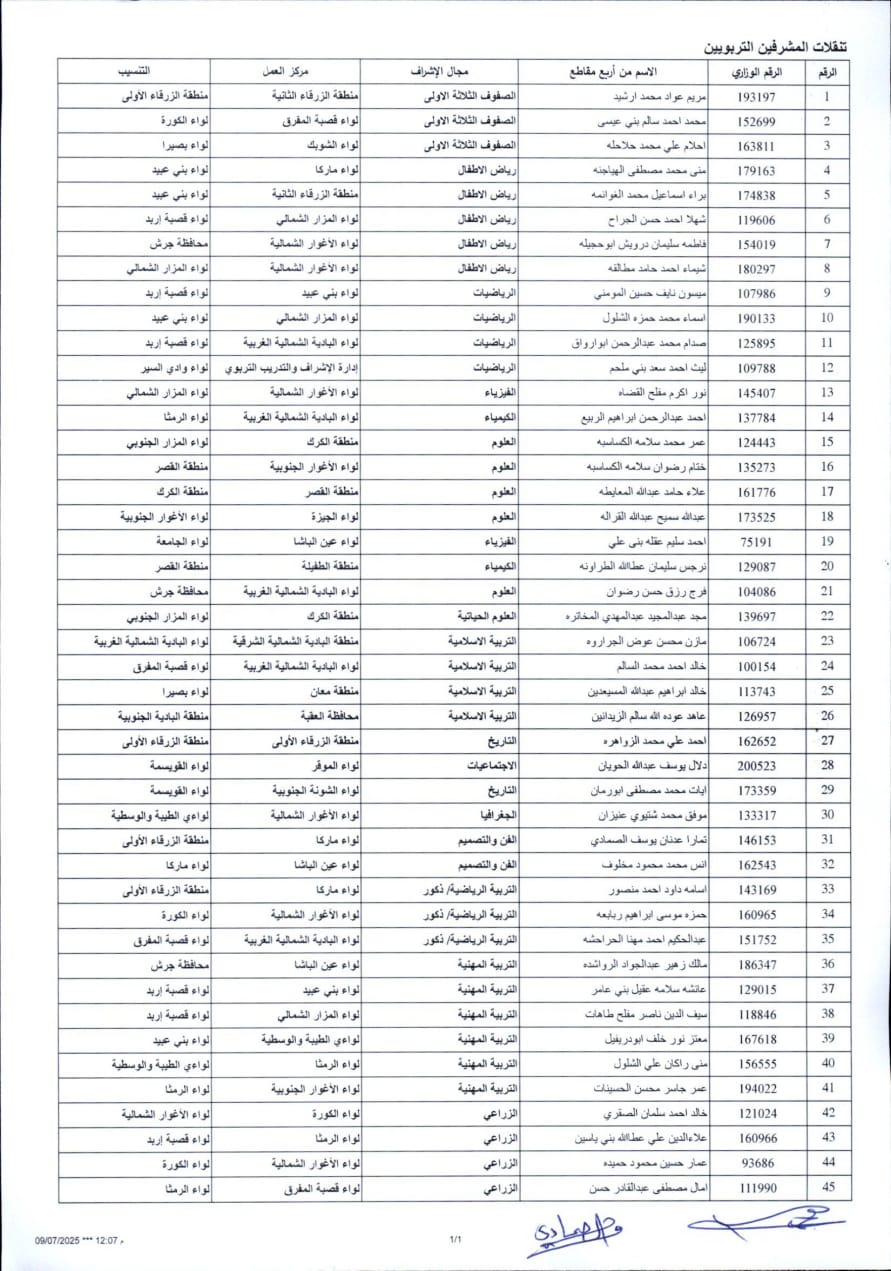 قرر وزير التربية والتعليم ترقية المذكورين في الكشف المرفق أدناه إلى وظيفة مشرف تربوي / أخصائي مبحث في مجال الإشراف والمديرية المبيّنة إزاء اسم كلّ منهم اعتبارا من تاريخه.