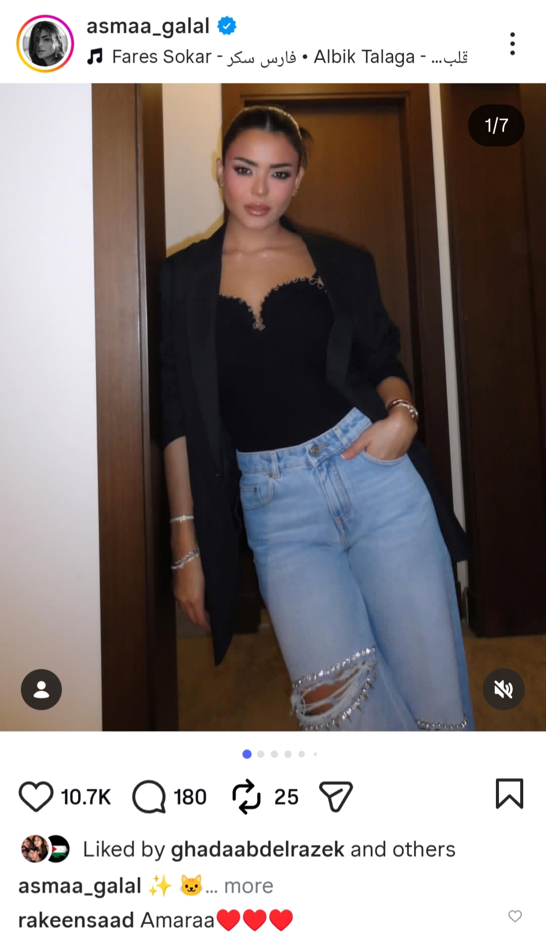 شاركت الفنانة أسماء جلال، جمهورها، صورة جديدة لها من أحدث جلسة تصوير، وذلك عبر حسابها بموقع التواصل الاجتماعي "إنستجرام”.