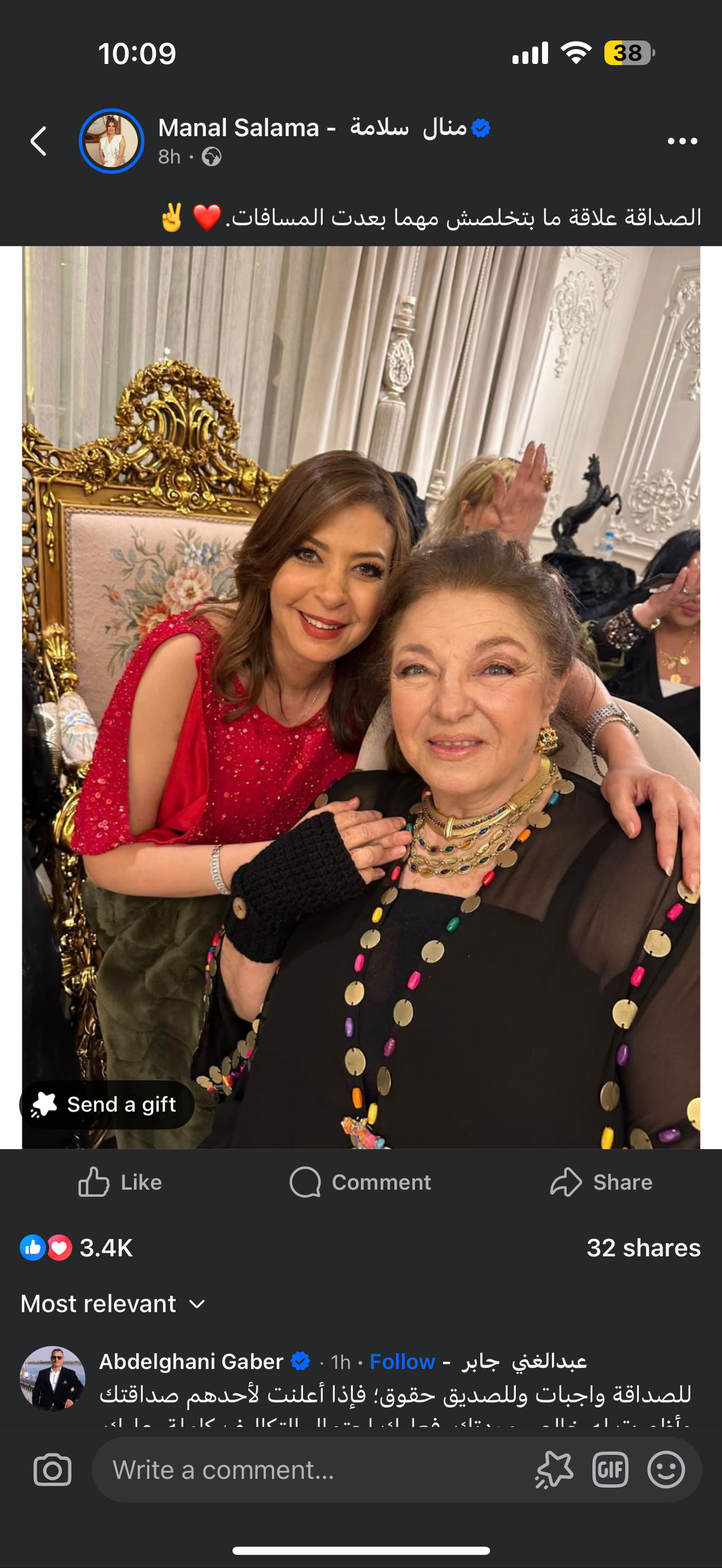 «الصداقة علاقة ما بتخلصش مهما بعدت المسافات»، في إشارة إلى قوة العلاقة التي تجمعها بالفنانة هدى رمزي.