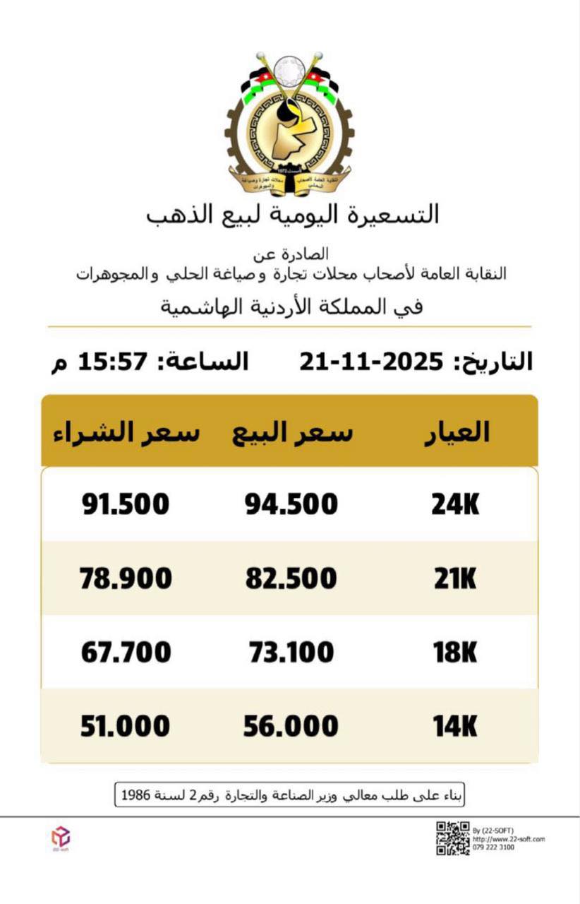 ارتفاع الذهب محليا مساء الجمعة وعيار 21 يبلغ 82.50 دينارًا