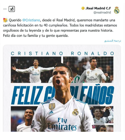 بعد بلوغه عامه الـ40.. رسالة من ريال مدريد إلى رونالدو (صورة)